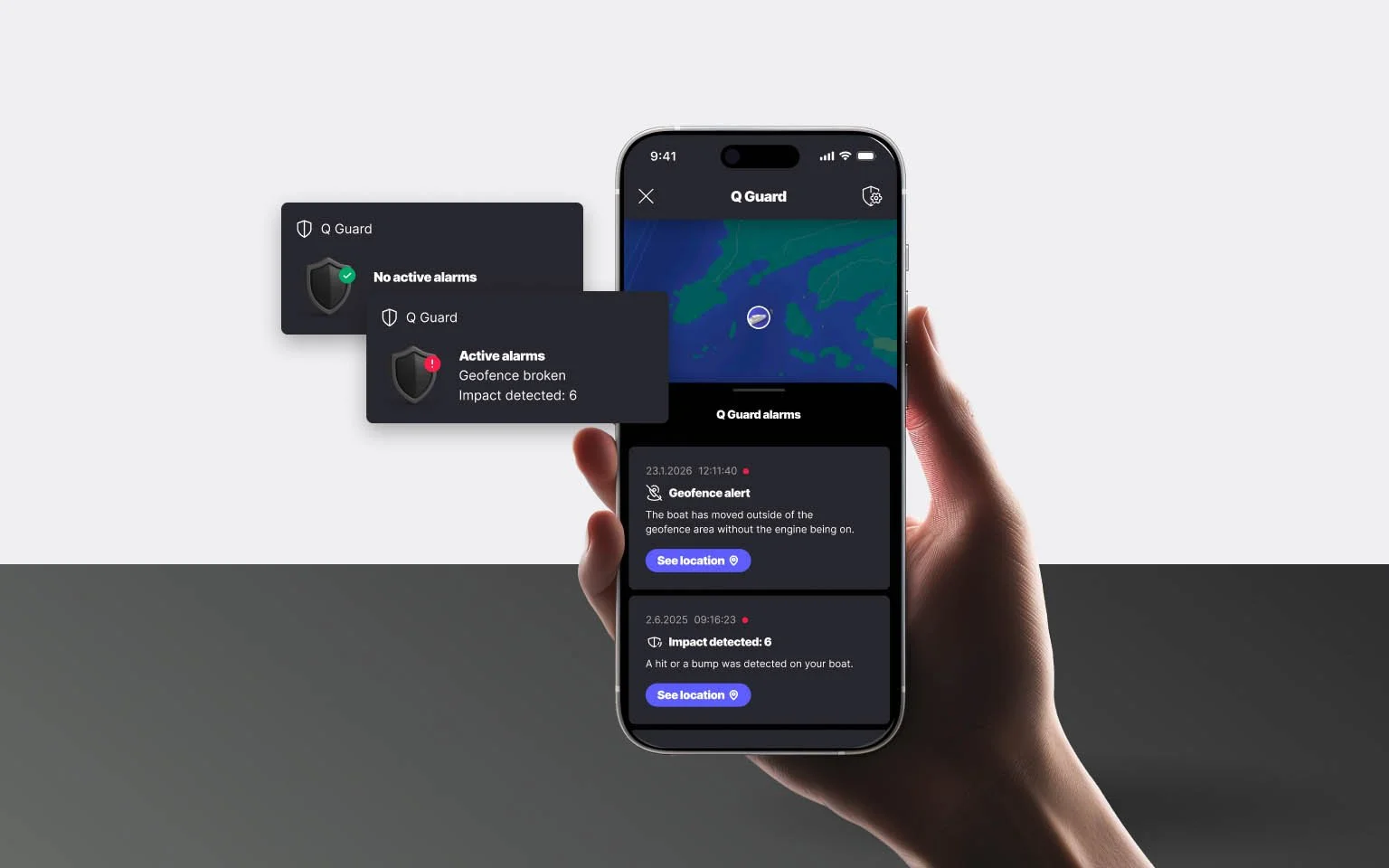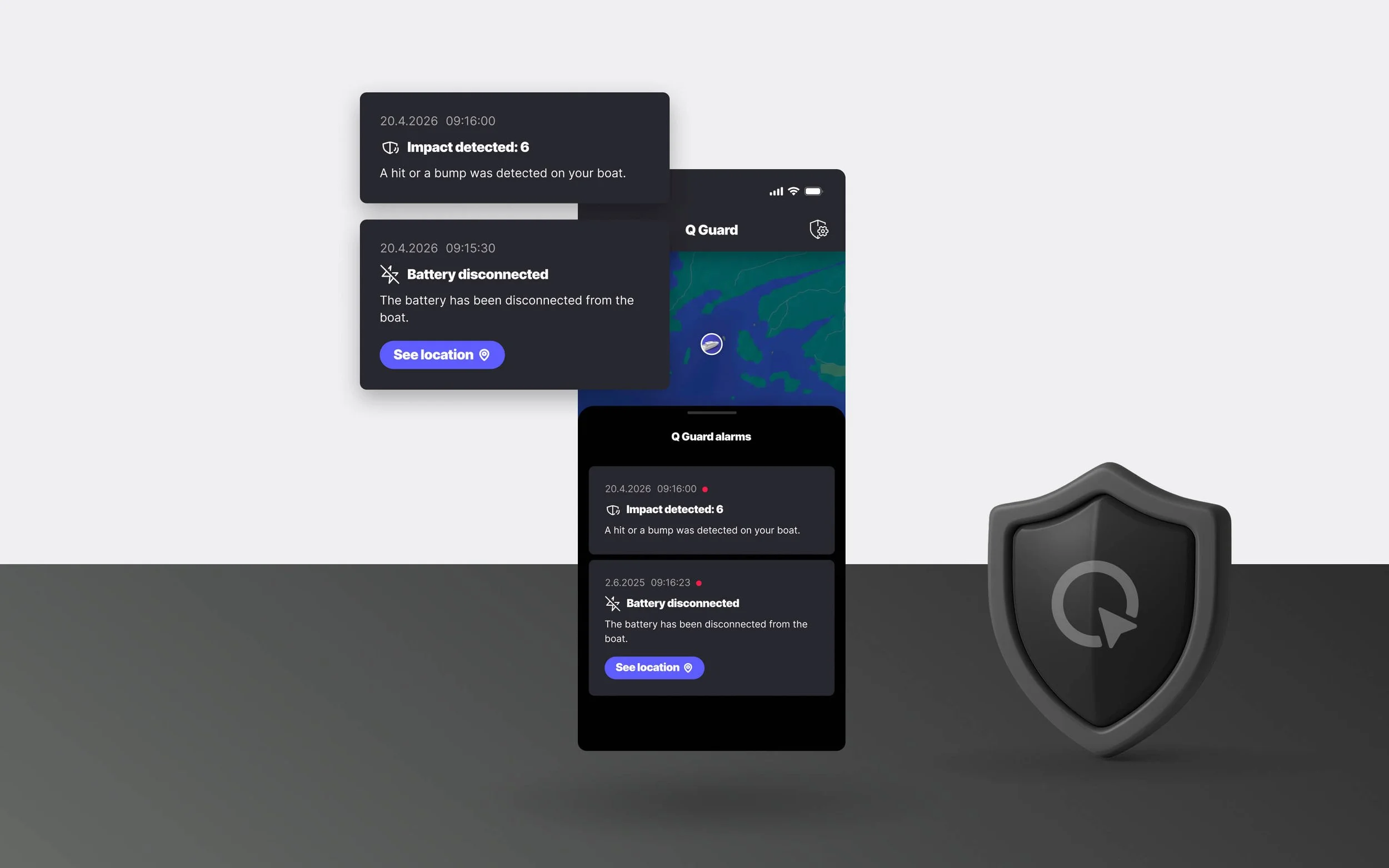 Q Guard is your boat's remote security and monitoring system. It keeps an eye on your boat around the clock and sends you an alert directly to your phone if something unexpected happens - whether you are at home, at work, or anywhere else.