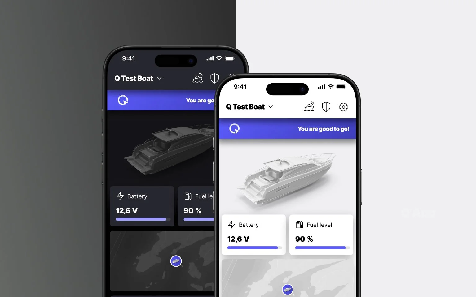 The Q App has a new visual style. The interface is cleaner and more consistent, and the app now reflects your boat brand's look more prominently than before. You can also choose between dark and light themes to suit your preference and the lighting conditions around you.