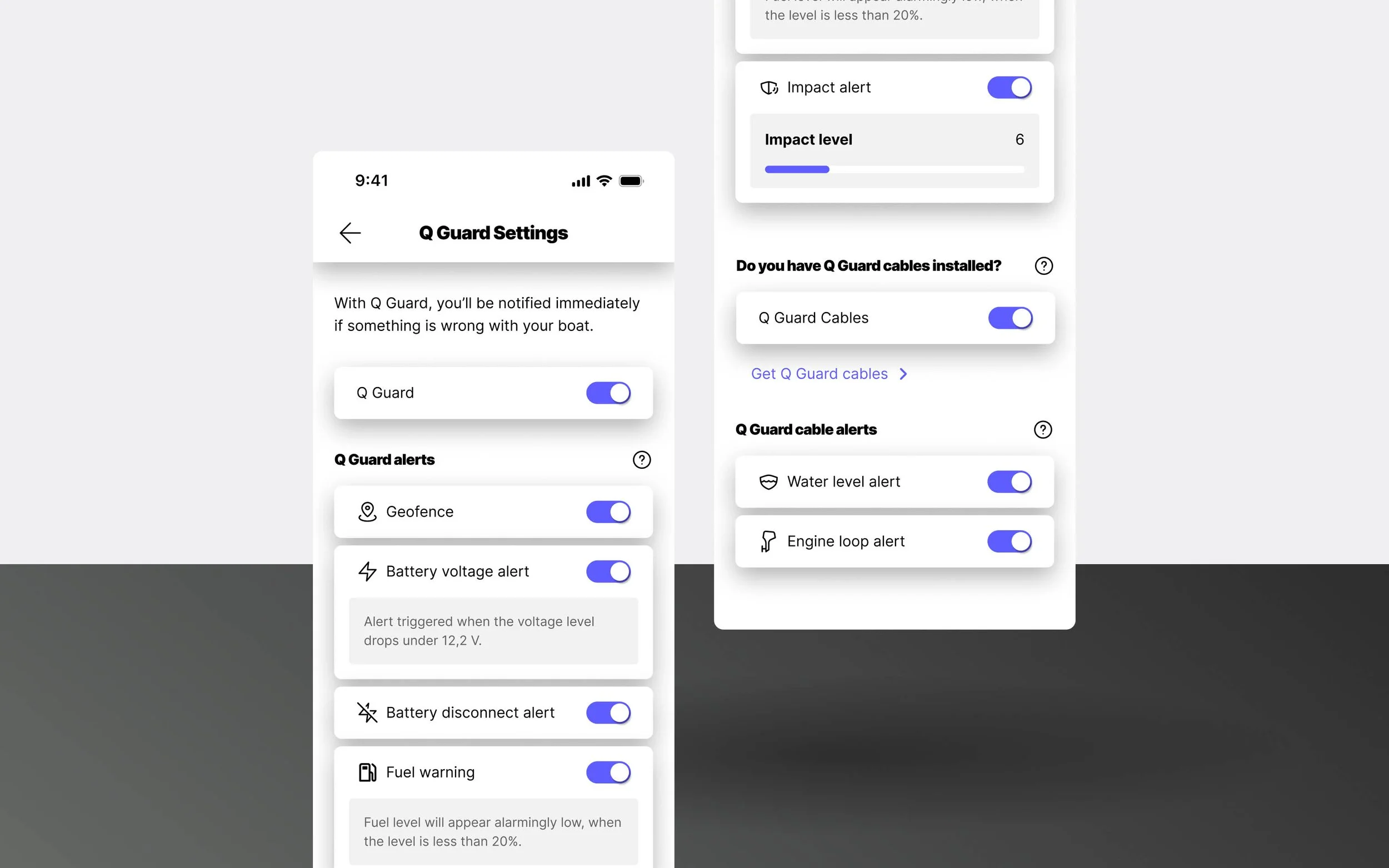 The Q Guard settings have been renewed to make the available alert options easier to understand and set up. Alerts are clearly divided into basic alerts that are built into all Q Displays, and additional Q Guard Cable alerts, to make it clearer what alerts are available to your boat.