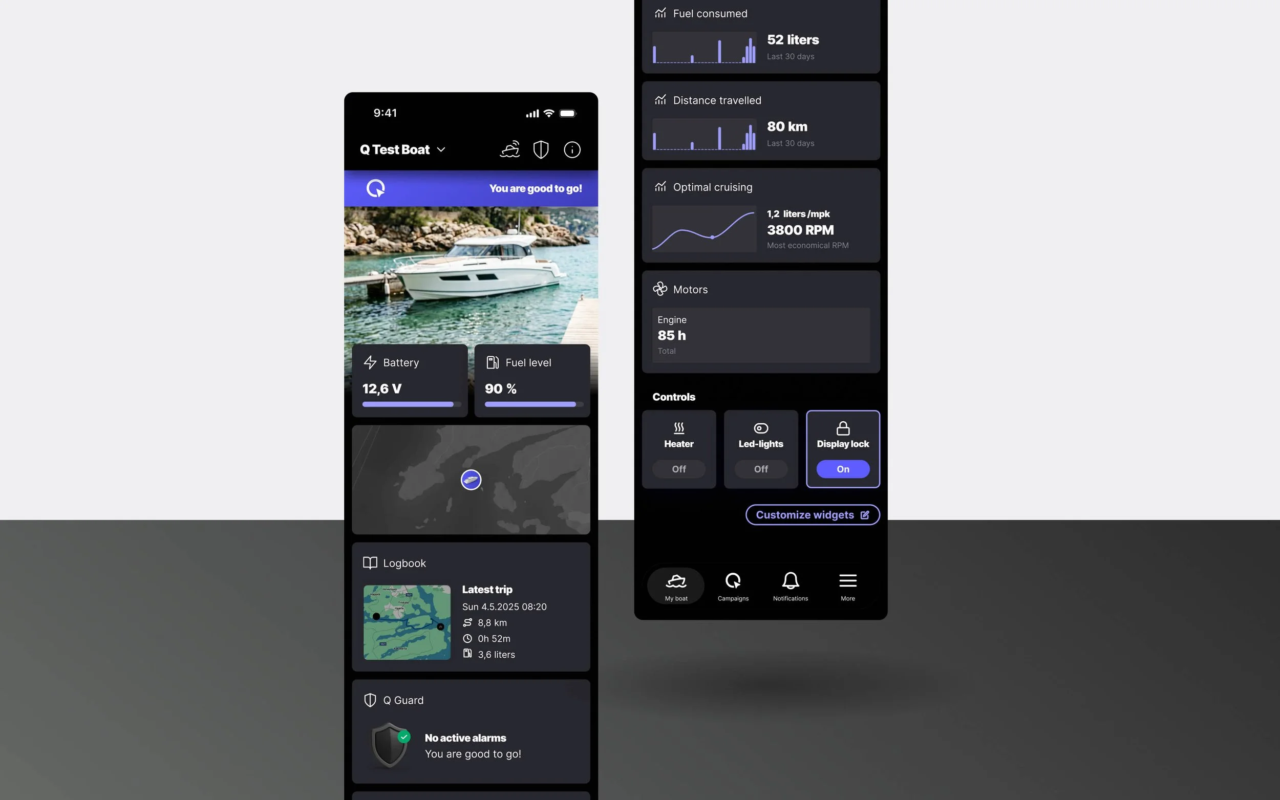 The redesigned home page gives you a complete overview of your boat at a glance. Battery and fuel levels, boat location, logbook, statistics, remote controls, and Q Guard alerts are all visible without navigating away from the home page. The most important information is right there when you open the app, giving you an instant picture of your boat's status.