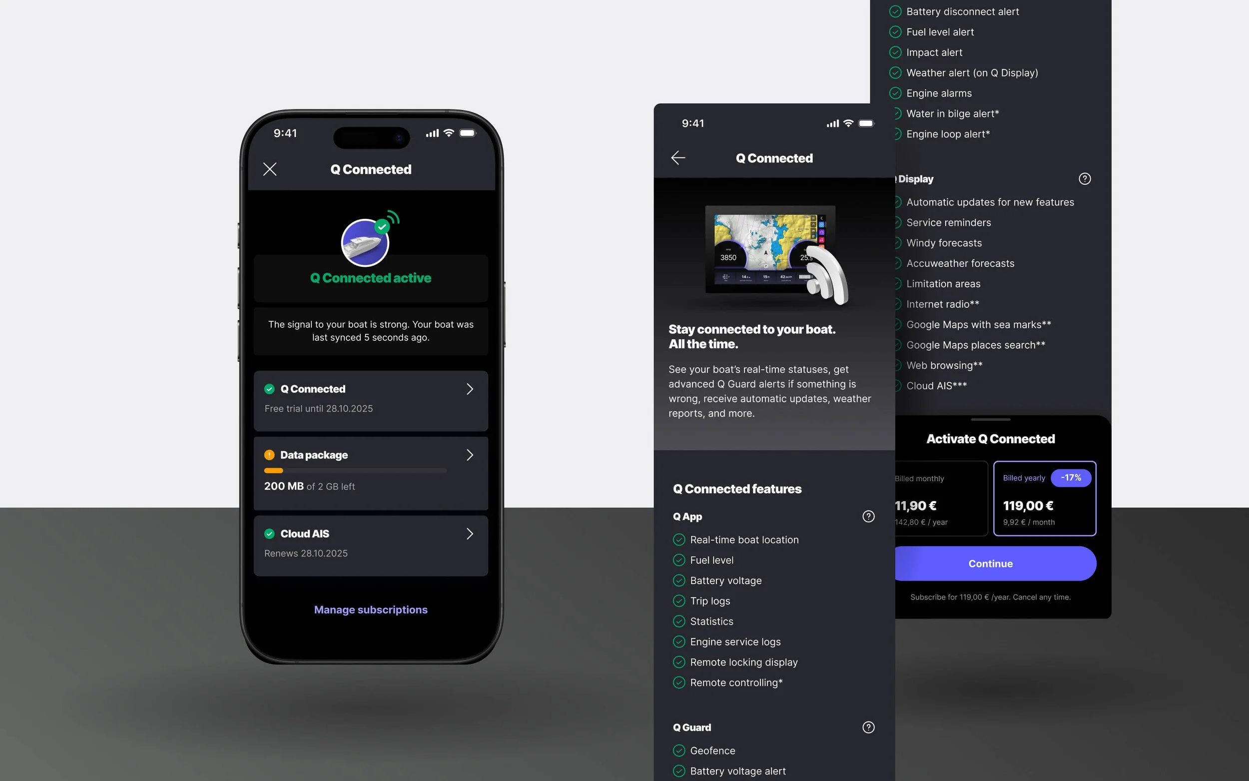 The new design brings a clearer look and feel, more intuitive navigation, better visibility of your boat's Q Connected status and subscription, and improved Q Guard alerts.