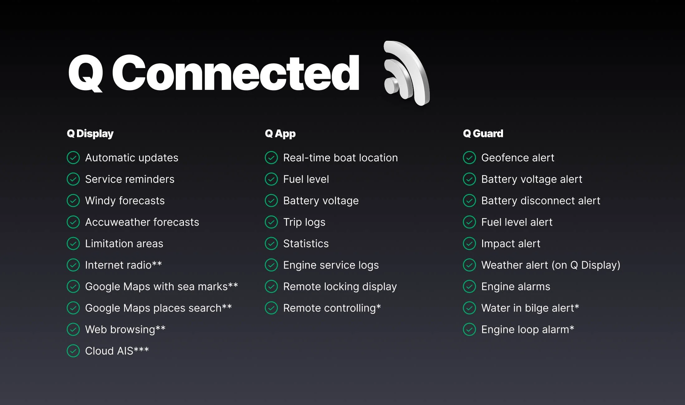 Q Connected is the subscription service that brings your Q Display, Q App and Q Guard to life. It keeps your Q Display connected to the internet through its built-in SIM, and connects your boat to the Q App so you can monitor and manage it remotely. Q Connected keeps your Q Display always up to date and online.