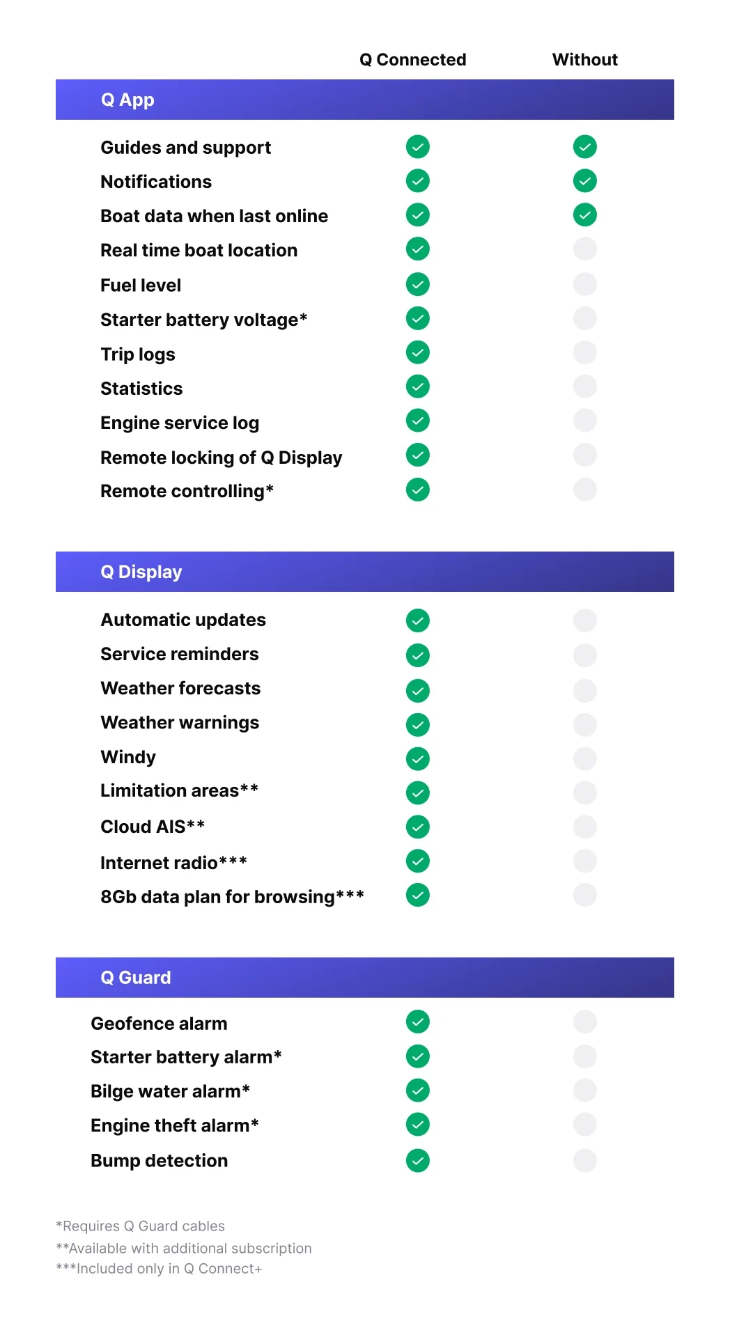 Q Connected upgrades your boat with smart features, with its 24/7 internet access. Check the list below for what you get with a Q Connected subscription and what you miss without it.